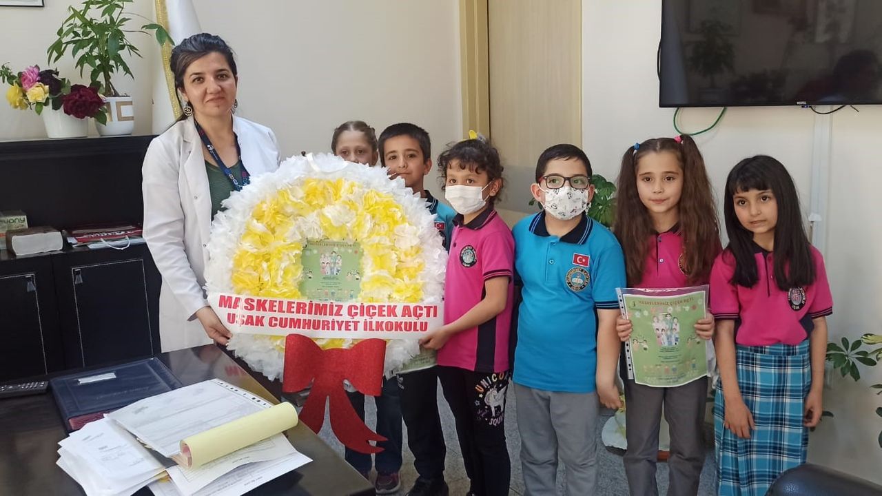 Uşak’ın en eski okullarından olan Cumhuriyet İlkokulu öğrencileri, "Maskelerimiz Çiçek Açtı" e-Twinning projesi çerçevesinde maskelerden çiçek yaptı. Projede görev alan öğrenci ve öğretmenler, Uşak Eğitim ve Araştırma Hastanesi Başhekimi Doçent Doktor Sema Can’ı ziyaret etti.