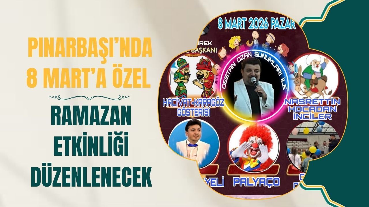 Pınarbaşı Belediyesi tarafından düzenlenen etkinliğin 8 Mart 2026 Pazar günü saat 21.00’de Belediye Düğün Salonu’nda gerçekleştirileceği bildirildi. Belediye tarafından yapılan duyuruda, programın 8 Mart Dünya Kadınlar Günü dolayısıyla düzenlendiği belirtilerek tüm vatandaşlar etkinliğe davet edildi.