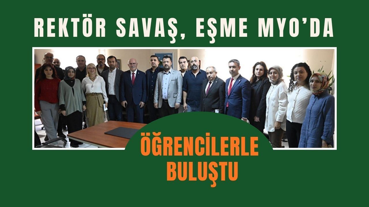 Ziyaret sırasında yapımı süren yeni Eşme MYO binasıyla ilgili de bilgi veren Rektör Savaş, inşaatın kısa sürede tamamlanması için yoğun çaba gösterdiklerini söyledi. Öğrencilerle buluşmanın ardından akademik kadroyla bir araya gelen Rektör Savaş, okulun mevcut durumu ve eğitim planlamaları hakkında Eşme MYO Müdürü Öğr. Gör. Salih Sezer’den bilgi aldı. Ziyaret programı kapsamında Rektör Prof. Dr. Savaş, Eşme Kaymakamı Mustafa Görmüş’ü de Rektör Yardımcısı Prof. Dr. Lütfi Özav ve Müdür Salih Sezer ile birlikte makamında ziyaret etti. Rektör Savaş’ın bu ziyareti, hem öğrenciler hem de akademisyenler tarafından moral ve motivasyon kaynağı olarak değerlendirildi.