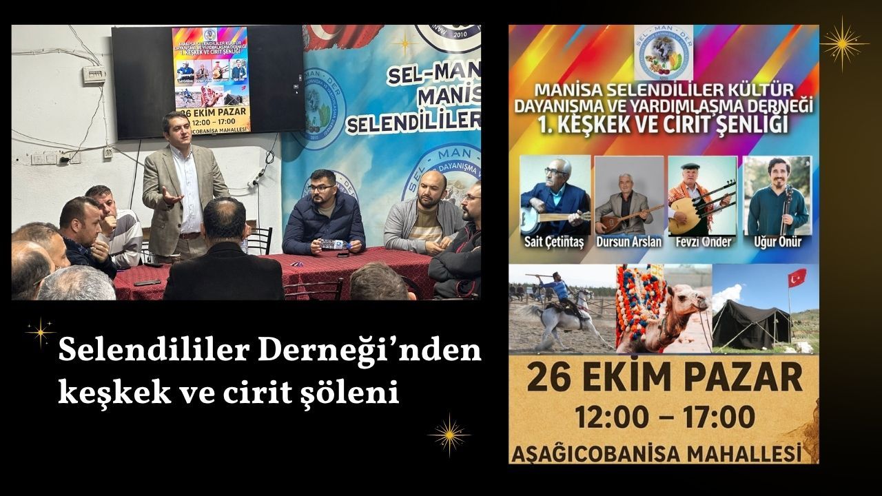 Manisa Selendililer Derneği tarafından bu yıl ilki düzenlenen Keşkek ve Cirit Şenliği, 26 Ekim Pazar günü Şehzadeler ilçesine bağlı Aşağıçobanisa Mahallesinde gerçekleştirilecek. Etkinlik, hem kültürel mirasın yaşatılmasını hem de hemşerilik bağlarının güçlendirilmesini amaçlıyor. Program, sabah saat 11.00’de bölgenin tanınmış hafız ve mevlithanlarının okuyacağı Kur’an-ı Kerim tilaveti, ilahiler ve dualarla başlayacak.