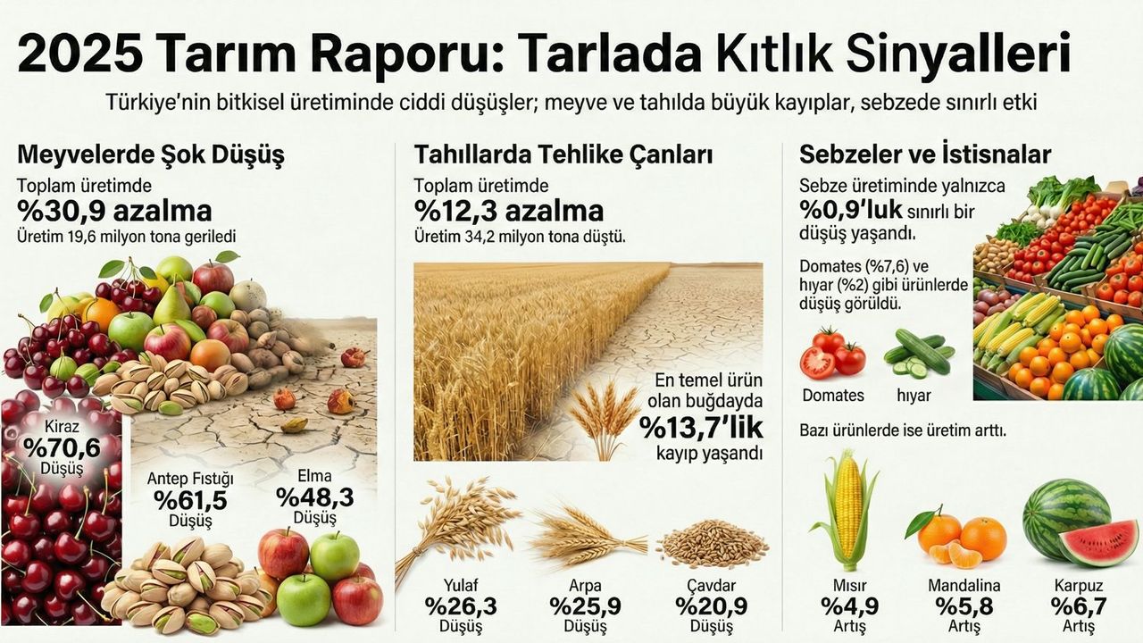 TÜİK verileri, özellikle iklim koşulları, girdi maliyetleri ve verimlilik sorunlarının bitkisel üretim üzerindeki baskısını bir kez daha gözler önüne serdi. Uzmanlar, üretimdeki bu düşüşün gıda fiyatları ve tarımsal sürdürülebilirlik açısından yakından izlenmesi gerektiğine dikkat çekiyor. (TÜİK)