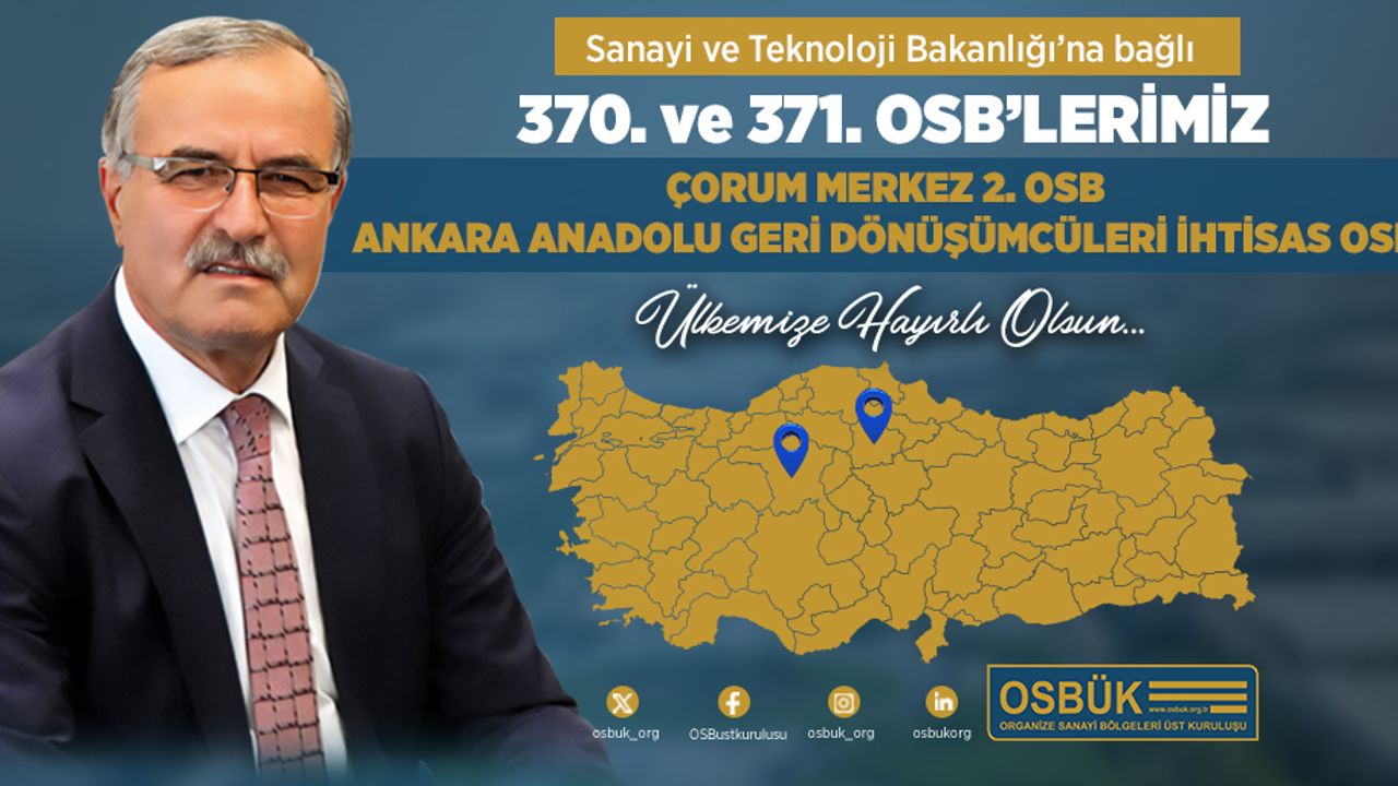 Sanayi ve Teknoloji Bakanlığı, Türkiye’nin üretim gücünü artıracak iki yeni organize sanayi bölgesinin daha kurulduğunu duyurdu. Buna göre, Çorum’da “Çorum Merkez 2. OSB” ve Ankara’da “Ankara Anadolu Geri Dönüşümcüleri İhtisas OSB” resmen tüzel kişilik kazandı. Bu gelişmeyle birlikte, Bakanlığa bağlı OSB sayısı 371’e, Tarım ve Orman Bakanlığı’na bağlı 45 Tarıma Dayalı İhtisas OSB (TDİOSB) ile birlikte Türkiye genelindeki toplam OSB sayısı 416’ya yükseldi.