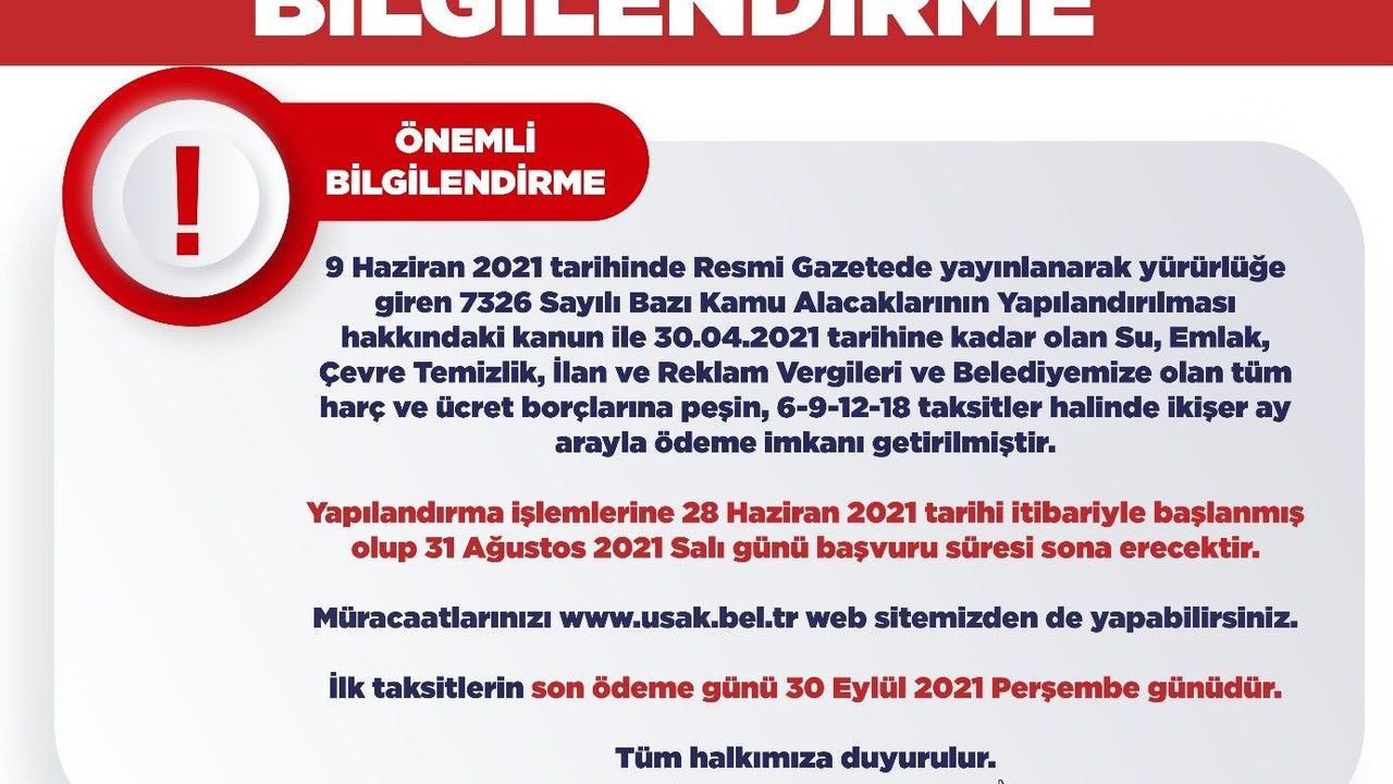 Uşak Belediyesince yapılan açıklamada Belediye’ye olan borçların yapılandırılmasında son gün 31 Ağustos 2021 Salı günü olduğu belirtilip ilk taksitlerin son ödeme günü 30 Eylül 2021 Perşembe günü olduğu hatırlatıldı..