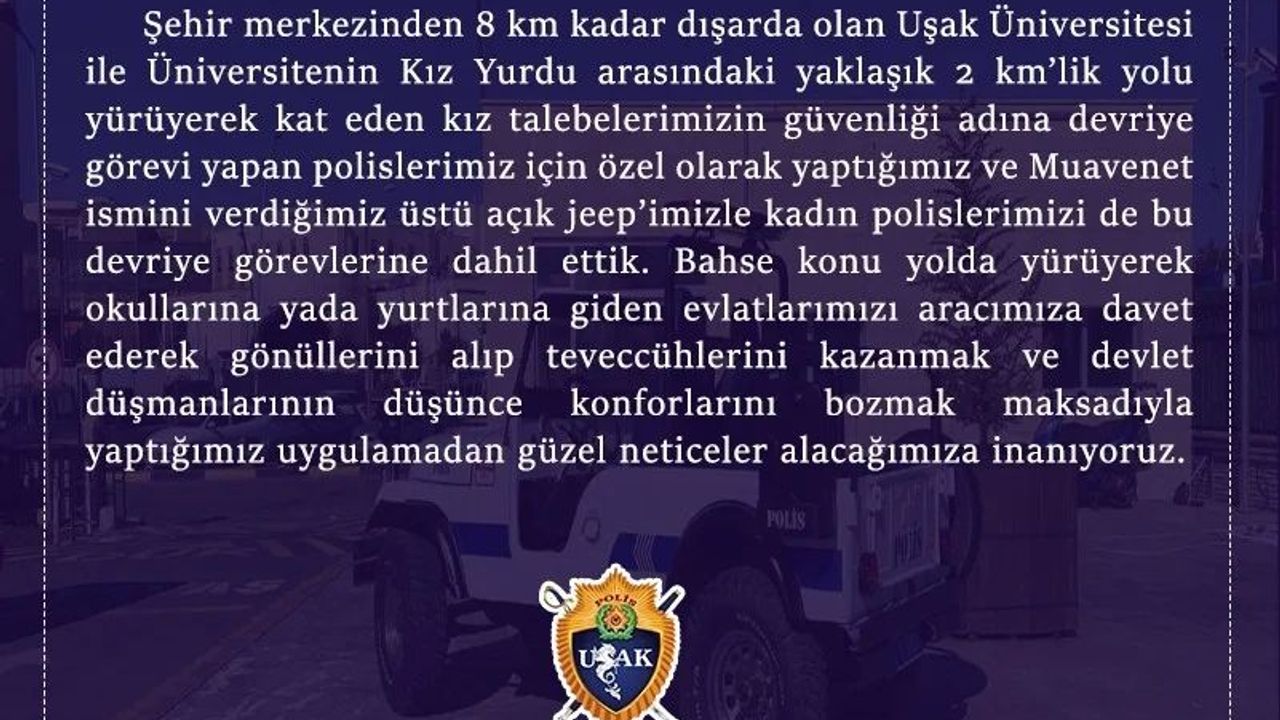 Uşak Emniyet Müdürlüğü üstü açık eski bir jeepi modİfiye ederek “Muavenet” adını verdi. Muavenet ile kadın polislerin de birlikte görev yaparak kız çocuklarımızın yol boyunca güvenliğinin sağlanacağı duyuruldu. Uşak Emniyet Müdürlüğü, konu ile ilgili yaptığı açıklamada; “Şehir merkezinden 8 km kadar dışarda olan Uşak Üniversitesi ile Üniversitenin Kız Yurdu arasındaki yaklaşık 2 km’lik yolu yürüyerek kat eden kız talebelerimizin güvenliği adına devriye görevi yapan polislerimiz için özel olarak yaptığımız ve *Muavenet* ismini verdiğimiz üstü açık jeep’imizle kadın polislerimizi de bu devriye görevlerine dahil ettik. Bahse konu yolda yürüyerek okullarına yada yurtlarına giden evlatlarımızı aracımıza davet ederek *gönüllerini alıp teveccühlerini kazanmak ve devlet düşmanlarının düşünce konforlarını bozmak* maksadıyla yaptığımız uygulamadan güzel neticeler alacağımıza inanıyoruz” bilgisini verdi.