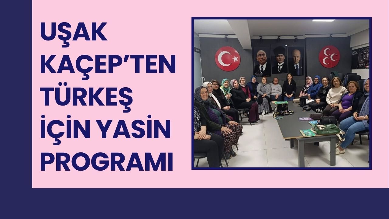 MHP Uşak İl Kadın, Aile, Çocuk ve Engelli Politikaları (KAÇEP) Başkanlığı tarafından, Milliyetçi-Ülkücü Hareket’in kurucusu merhum Alparslan Türkeş’in hatırasına yönelik anlamlı bir program gerçekleştirildi. İl binasında düzenlenen Yasin-i Şerif programında, Kur’an-ı Kerim tilaveti eşliğinde dualar edildi. KAÇEP yönetiminin öncülüğünde gerçekleştirilen programa katılanlar, merhum Türkeş’i rahmet ve minnetle andı.