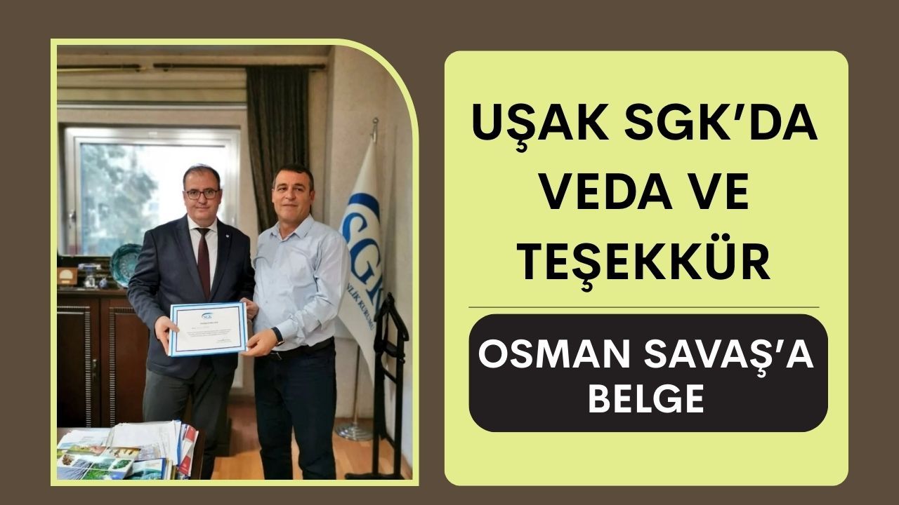 Uşak Sosyal Güvenlik İl Müdürlüğü’nde anlamlı bir veda programı düzenlendi. Uşak Sosyal Güvenlik İl Müdürlüğü İl Müdürü İbrahim Öztürk, kurumda görev yaptığı süre boyunca sunduğu hizmetler dolayısıyla Osman Savaş’a teşekkür belgesi takdim etti. Programda, kamu hizmetlerinde süreklilik, ekip ruhu ve kurumsal hafızanın önemi vurgulandı. İl Müdürü Öztürk, Osman Savaş’ın görev süresi boyunca gösterdiği özverili çalışmanın kuruma önemli katkılar sunduğunu belirterek, emeklerin görünür kılınmasının çalışma motivasyonunu artırdığını ifade etti.