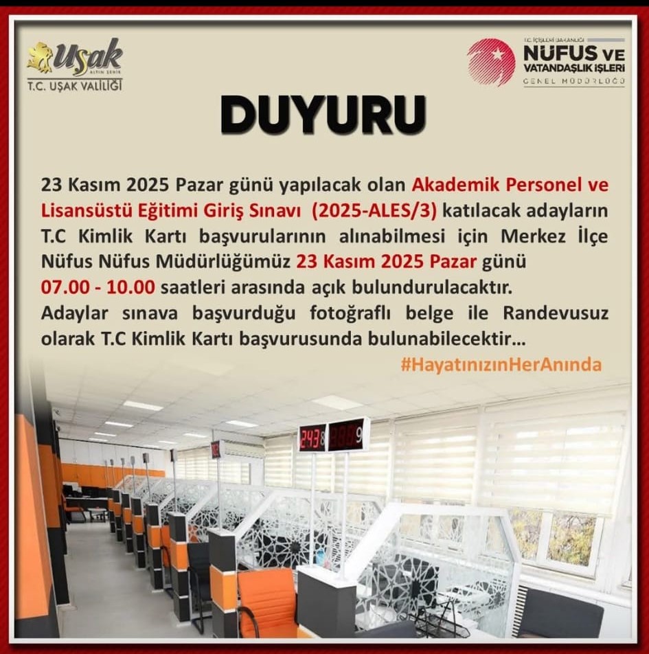 Uşak Valiliği, 23 Kasım 2025 Pazar günü yapılacak Akademik Personel ve Lisansüstü Eğitimi Giriş Sınavı (2025-ALES/3) öncesinde adaylara kolaylık sağlanacağını duyurdu. Buna göre Uşak Merkez İlçe Nüfus Müdürlüğü, sınav sabahı 07.00–10.00 saatleri arasında özel olarak açık tutulacak.