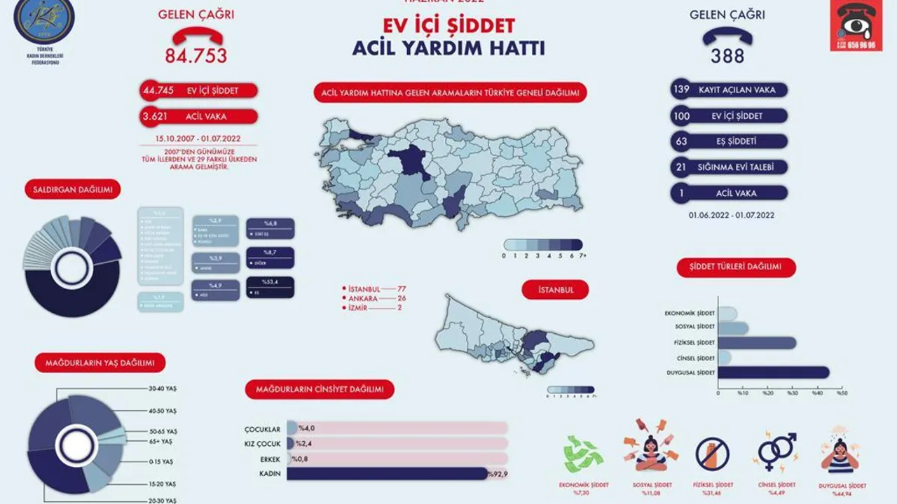 TKDF tarafından hazırlanan "Ev İçi Şiddet Acil Yardım Hattı" 2022 raporu yayınlandı. Rapora göre haziran ayında yardım hattına toplam 388 çağrı ulaştı. 37 farklı ilden gelen çağrıların 77'si İstanbul'dan, 26'sı Ankara'dan, 8'i ise Adana'dan iletildi. Ayrıca 34 farklı şehirden çağrılar geldiği belirtilen raporda diğer iller şöyle sıralandı: