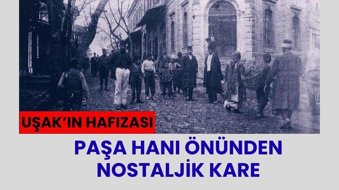 Paşa Hanı’nın önünde hayatın akışıFotoğrafta dikkat çeken en önemli unsurlardan biri de Paşa Hanı’nın mimari yapısı. Dönemin ticari ve sosyal hayatında önemli bir yer tutan hanın önünde toplanan kalabalık, o yıllarda bu bölgenin Uşak’ın en canlı noktalarından biri olduğunu ortaya koyuyor. Bugün modern yapıların yükseldiği aynı noktada, bir zamanlar insanların günlük yaşamlarını sürdürdüğü bu alanın, kentin belleğinde ayrı bir yeri bulunuyor.