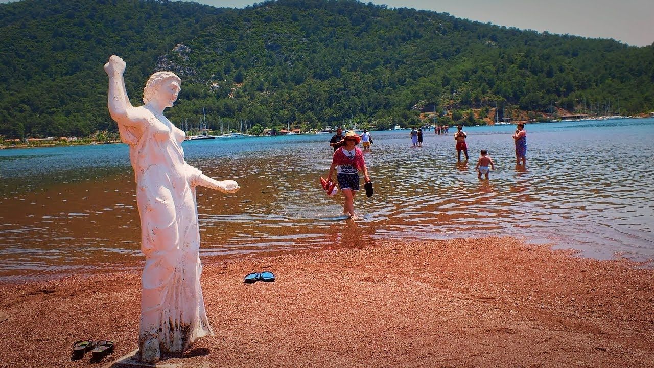 Efsaneye göre Bybassos Kralı'nın kızı güzel prenses ile bir balıkçı birbirlerine aşık olurlar. Kız geceleri sahile çıkıp, kandille balıkçıya işaret verir, balıkçı da karşı kıyıdan sandalıyla gelir ve buluşurlar. Kral bir gece kızını takip ettirerek balıkçının denizden geldiğini, kızının kumsalda onu beklediğini, beklediği yeri de elindeki bir ışıkla balıkçıya haber verdiğini öğrenir. Kral askerlerine kızını kumsalda yakalayıp, elindeki ışığı alarak balıkçıya işaret vermelerini ve balıkçıyı yakalamalarını emreder. Denilen yapılır. Balıkçı karşı kıyıdan ışığı gördüğü anda atlar kayığına, kürek çekmeye başlar. Kız askerlerin elinden kurtulup denizin ortasındaki delikanlıya doğru koşmaya başladığı anda bir mucize gerçekleşir ve kızın her adım attığı deniz, anında kumsala dönüşür. Arkadan koşan askerlerin üzerlerindeki ağırlık onları suya batırdığı anda bir asker ok ve yayına sarılır. Amacı delikanlıyı vurmaktır ama ok kıza saplanır. Efsaneye göre de kumların rengi kızın kanıyla kırmızıya dönüşür. Delikanlı, okla vurulan prensesi alıp kayığıyla uzaklaşır ve bir daha ikisini gören olmaz. (HABER MERKEZİ)