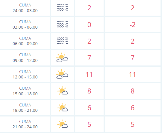 06.00–09.00 saatlerinde sıcaklık 2 dereceye yükselirken, güneşin yüzünü göstermesiyle kentte hava yavaş yavaş yumuşamaya başlıyor.
