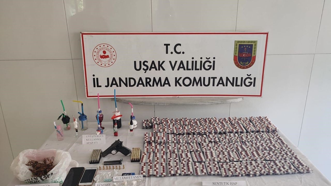 Uşak'ta jandarma ekiplerince yapılan operasyonda 3 bine yakın sentetik ecza hap, 10 gram metamfetamin, 20 gram kubar esrar, 22 adet uyuşturucu içme aparatı, 1 ruhsatsız tabanca ve çok sayıda fişek ele geçirilirken 2 kişi de ekiplerce gözaltına alındı.