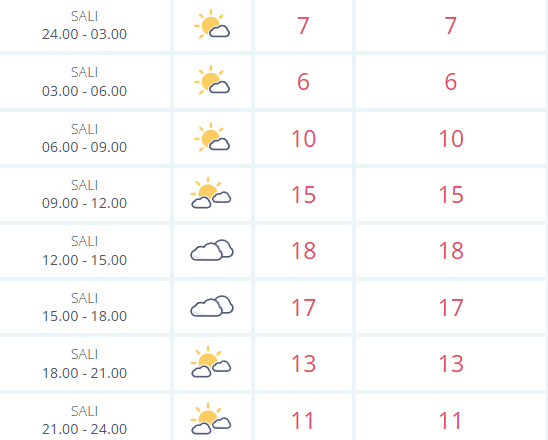 Günün ilerleyen saatlerinde hava ısınmaya başlıyor. 09.00–12.00 arasında 15 derece ölçülmesi öngörülürken, 12.00–15.00 diliminde günün en yüksek sıcaklığı olan 18 dereceye ulaşılacak. Bu saatlerde bulutluluk devam etse de yağış beklenmiyor.