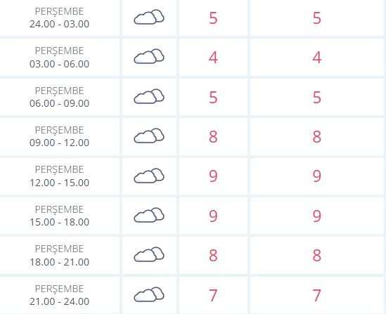 Perşembe günü gece yarısından sonra Uşak’ta hava çok bulutlu seyredecek. Saat 03.00 ile 06.00 arasında sıcaklık 4 dereceye kadar inerken, sabah saatlerinde bulutlu gökyüzü etkisini sürdürecek. 06.00–09.00 saatleri arasında sıcaklık 5 derece seviyelerinde olacak.