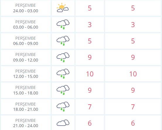 12.00–15.00 aralığında günün en yüksek sıcaklığı 10 derece olarak ölçülecek ve yağış devam edecek.