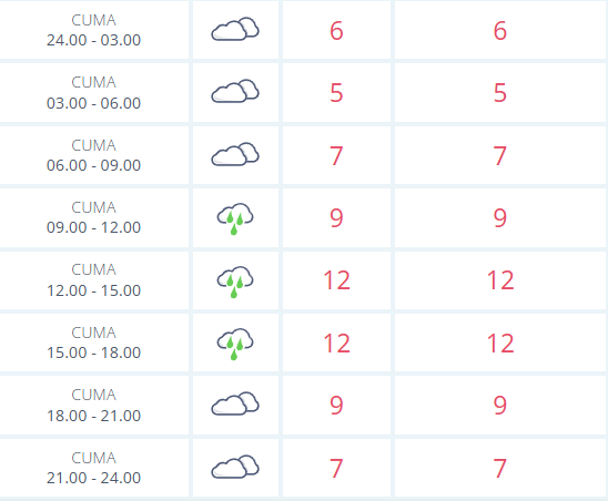 Günün ilerleyen saatlerinde ise kent genelinde hava koşullarında belirgin bir değişim yaşanacak. Özellikle 09.00 ile 18.00 saatleri arasında aralıklı yağmur geçişlerinin etkili olması öngörülüyor. Bu zaman diliminde sıcaklıkların 9 ila 12 derece arasında seyredeceği tahmin ediliyor.