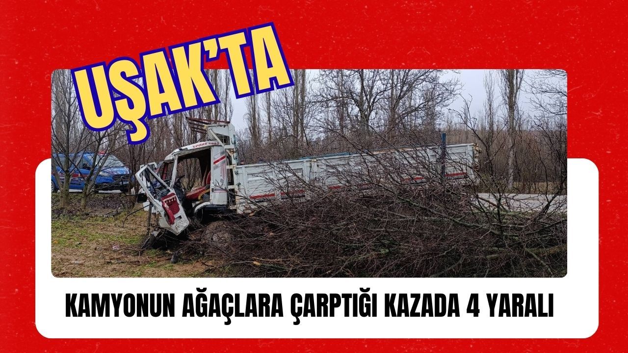 Uşak’ın Banaz ilçesinde meydana gelen trafik kazasında dört kişi yaralandı. Kaza, Yazıtepe köyü yakınlarında yaşandı. Edinilen bilgilere göre, M.D. (45) idaresindeki 64 ACY 172 plakalı kamyon, sürücüsünün direksiyon hâkimiyetini kaybetmesi sonucu yol kenarındaki ağaçlara çarptı. Ağaçları deviren kamyon, kontrolden çıkarak tarlaya girip durabildi.