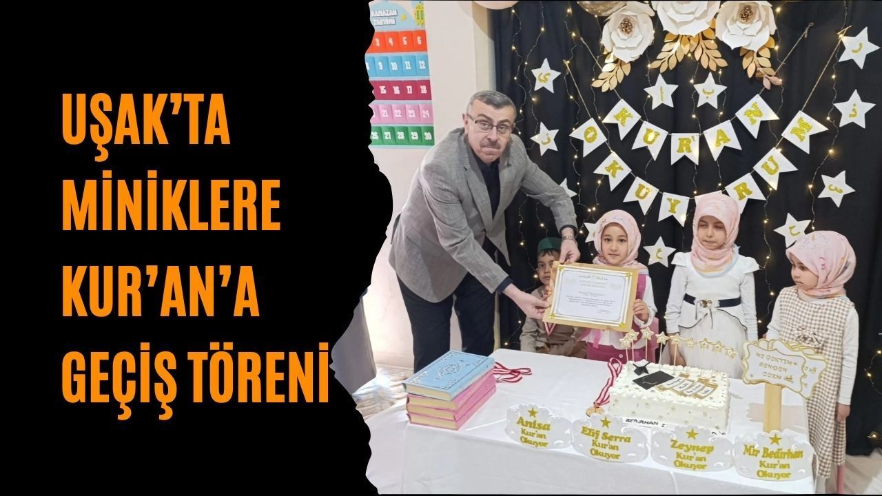 Uşak’ta faaliyet gösteren Hz. Erkam 4-6 Yaş Kur’an Kursu’nda eğitim gören öğrenciler için Kur’an’a geçiş töreni düzenlendi. Minik öğrencilerin heyecanına aileleri ve kurs öğreticileri de ortak oldu. Duygu dolu anların yaşandığı programda, Uşak İl Müftüsü Mesut Harmancı ve Müftü Yardımcısı Şeyda Bertan Uysal, Kur’an-ı Kerim okumaya geçen öğrencilere belgelerini takdim etti. Tören boyunca çocukların mutluluğu dikkat çekerken, aileler de bu özel ana tanıklık etti.