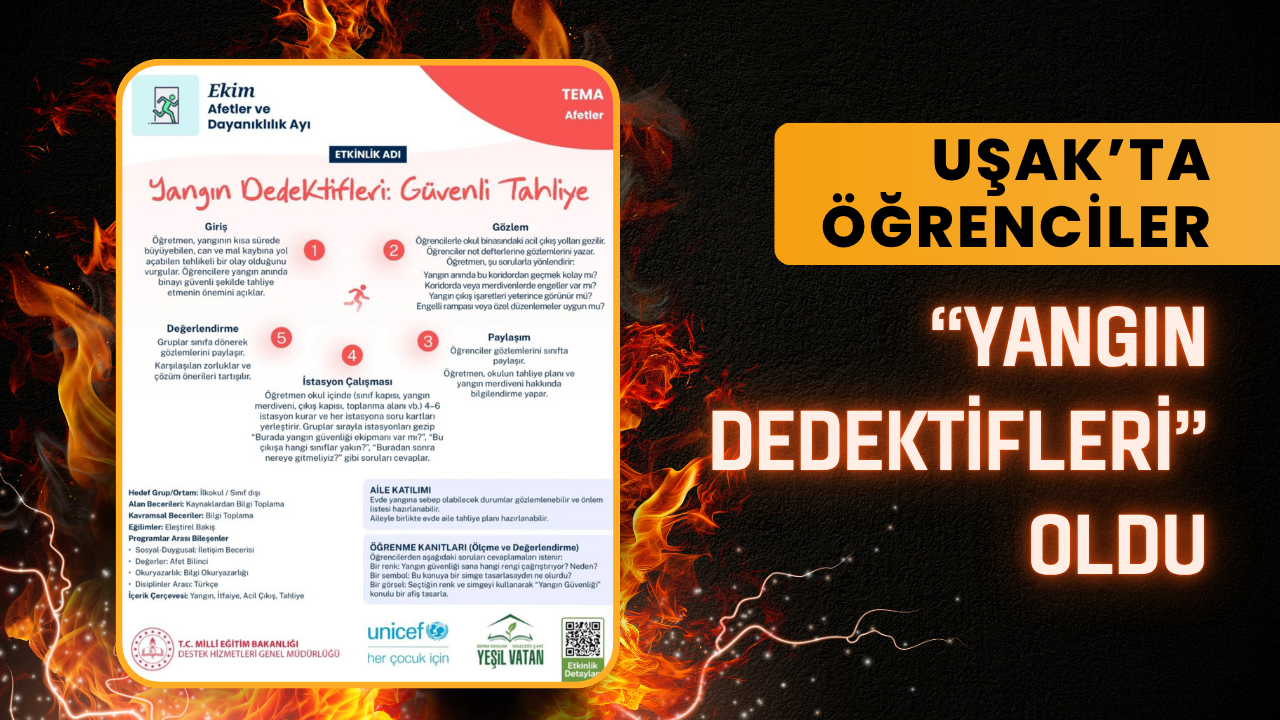 Uşak İl Milli Eğitim Müdürlüğü, “Yeşil Vatan – Benim Okulum Geleceğe ÇARE” projesi kapsamında öğrencileri afetlere karşı bilinçlendirmeye devam ediyor. İlimizde dün gerçekleştirilen etkinliğin teması “Yangın Dedektifleri: Güvenli Tahliye” olarak belirlendi. İlkokul düzeyinde planlanan etkinlikte öğrenciler, acil çıkış yollarını keşfederek yangın anında yapılması gerekenleri uygulamalı olarak öğrendi. Programın amacı, çocukların afet anında soğukkanlı davranabilmeleri ve güvenli tahliye yollarını doğru şekilde kullanabilmeleri konusunda farkındalık kazandırmak oldu.