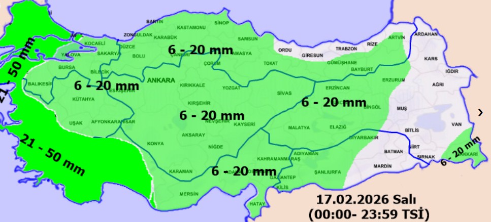 17 Şubat Salı gününe ait haritada ise yağışlı alanın Türkiye genelinde daha geniş bir bölgeye yayıldığı görülüyor. Uşak yine 6–20 mm bandında yer alırken, Ege’nin güneybatısında 21–50 mm aralığı öne çıkıyor. Özellikle bugün 15.00 sonrası ve akşam saatlerinde ani sağanak geçişlerine karşı dikkatli olunması gerekiyor.