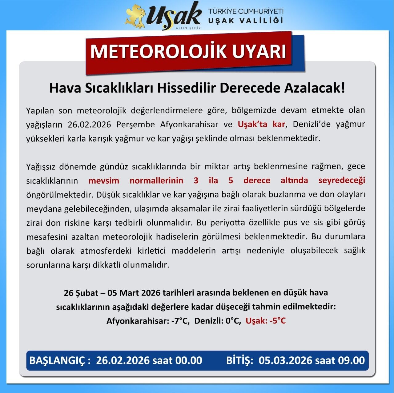 Uşak Valiliği tarafından yapılan meteorolojik değerlendirmeye göre kentte etkisini sürdüren yağışlı hava dalgası yeni bir soğuk hava süreciyle birleşiyor. 26 Şubat Perşembe gününden itibaren Uşak’ta kar yağışı beklenirken, gece saatlerinde sıcaklıkların mevsim normallerinin 3 ila 5 derece altına ineceği bildirildi. Uzmanların tahminlerine göre 26 Şubat ile 5 Mart 2026 tarihleri arasında en düşük hava sıcaklığı Uşak’ta -5 dereceye kadar gerileyecek. Aynı süreçte Afyonkarahisar’da -7 derece, Denizli’de ise 0 derece ölçülmesi öngörülüyor. Özellikle gece ve sabah saatlerinde buzlanma ve don olaylarının görülme ihtimali artıyor.