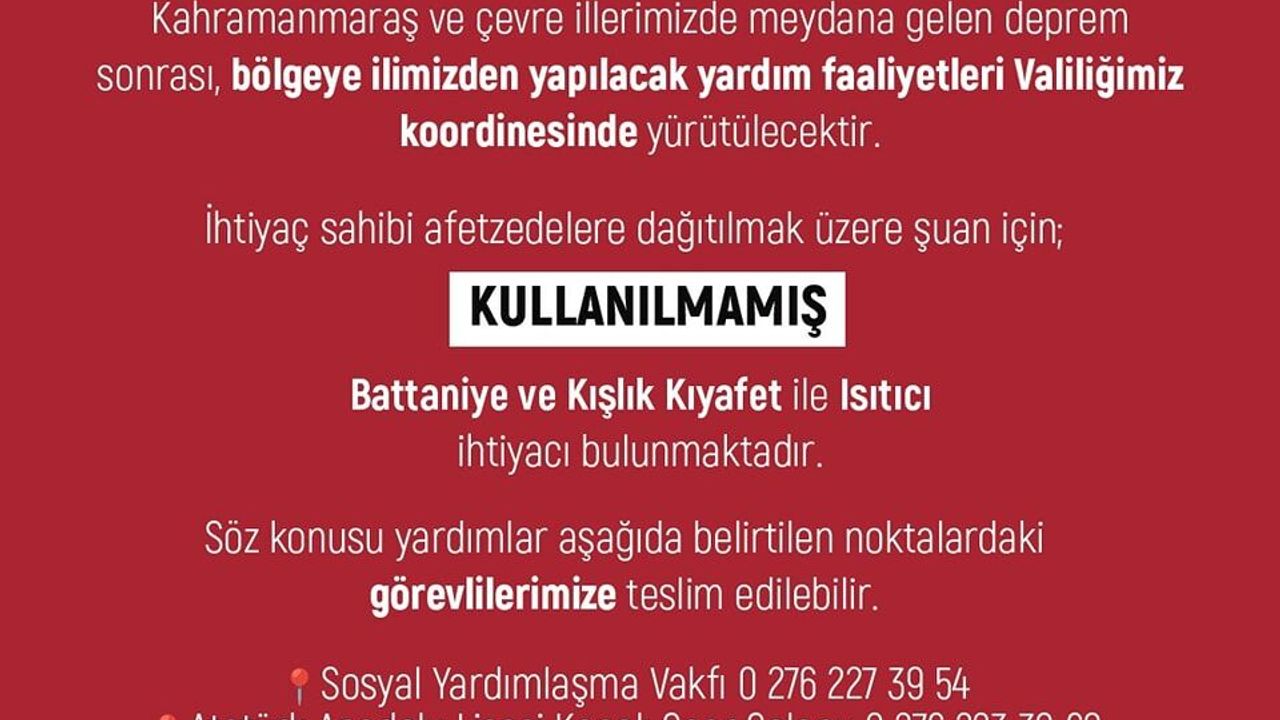 Uşak Valiliği, Kahramanmaraş’taki deprem nedeniyle vatandaşlardan bölgeye destek için kullanılmamış battaniye, kışlık kıyafet ve ısıtıcıları belirlenen adreslere teslim etmesi çağrısı yaptı.
