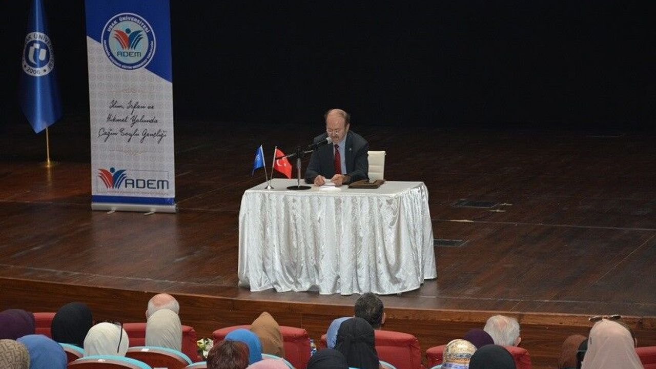 Öğrencilerinin yoğun katılım gösterdiği konferansın sonunda Rektör Prof. Dr. Ekrem Savaş ve Memur-Sen Uşak İl Başkanı Muhammed Aloğlu, Yusuf Kaplan’a teşekkür plaketi verdiler.